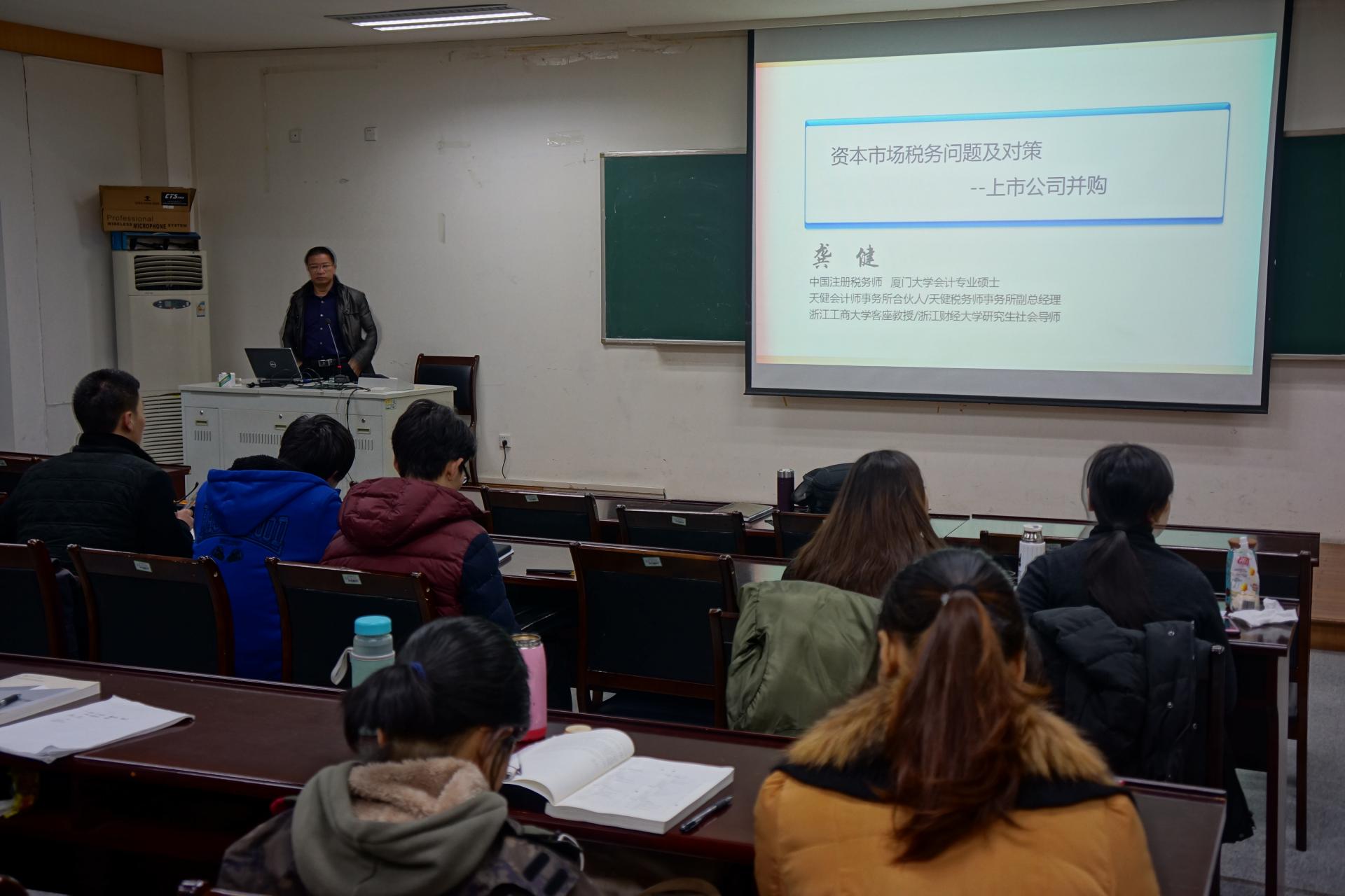 为了提升公司税务专硕办学水平,公司在部分专业必修课程尝试引进校外税务精英参与课堂教学这一做法。其中,2016级税务专硕的《中国税制(高级)》课程邀请了天健会计师事务所合伙人龚健老师承担部分教学任务。