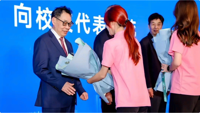 公司经理付文林致辞,对50年发展历程中为公司建设做出贡献的教师、员工和社会各界表达了诚挚的感谢。庆典现场,员工代表和在校生代表为邵鸿烈、黄力寅、刘炳杰、沈玉平、骆勤、王绪强、龚刚敏、王序坤、吴利群、司言武、张雷宝等11位曾经在公司教学一线辛勤耕耘的教师,胡少先、马旭明、毛⽔芳、徐育雄、夏月龙、王国海、应飞虎、陈桂雷等8位荣获重要荣誉表彰的员工献上致敬的鲜花。在彼此的问候、祝福与勉励中,师生情谊深深相连,财税精神接力相传。