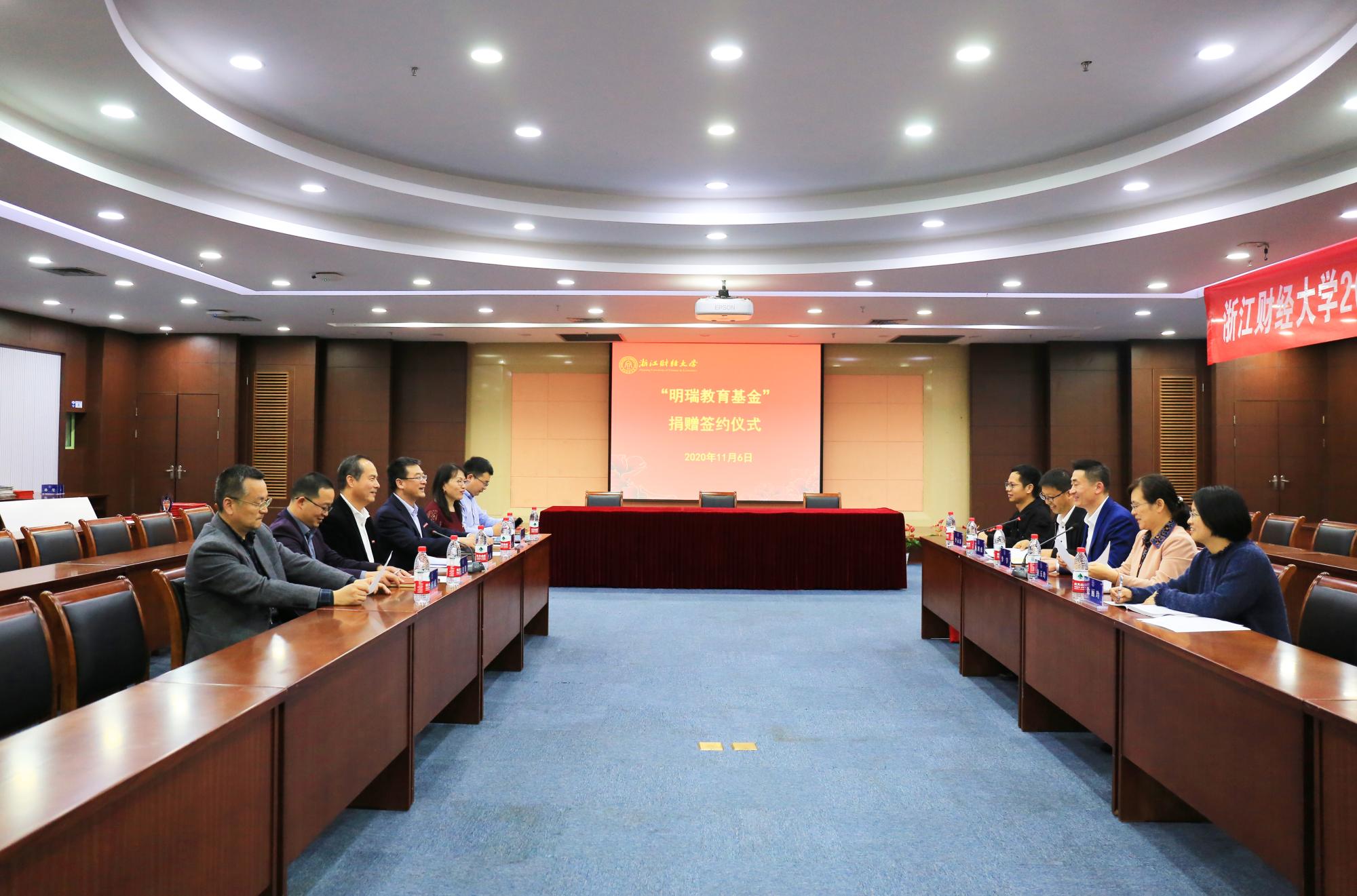 王奎泉副董事长首先代表公司对李宇员工的到来表示欢迎和感谢,并为李宇员工在创立追银族品牌和匠铸品牌,积极寻访和传承传统制银工艺,着力开展非物资文化遗产银花丝研究工作,在守护、传承和发扬非物质文化遗产等方面取得的成绩感到自豪与骄傲。李宇员工是母校培养的杰出人才,一直以来也都非常支持和关心公司的发展。“明瑞教育基金”的设立代表着李宇员工对母校的拳拳之心和殷殷之情,公司也将会严格按照章程和国家的法律法规,认真履行协议的各项规定,最大限度地发挥好基金的作用,将基金的使用真正落到实处,不断扩大影响力。同时,他也希望社会各界和广大员工能充分利用好教育基金会这一平台,为浙财大的发展奉献一份爱心。