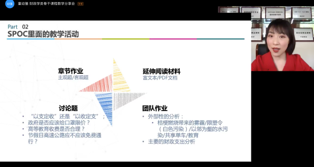 围绕本次分享会的主题,童幼雏老师以yl23411永利官网登录《财政学》课程为例,详细展示了疫情期间如何开展线上教学及日常混合式教学的相关情况。从前期公司财政学的慕课建设、SPOC建设到教学过程中的直播及慕课堂的使用、应急处理等多方面进行了全面的介绍,正面回答各高校疫情期间在线教学过程中疑虑的“如何从传统教学全面转到线上教学”“线上教学需要哪些资源或技术平台”“没有慕课资源的公司如何开展线上教学”“在线教学如何监管员工的学习过程”“看不到员工,如何与员工互动”“如何对教师们进行教学督导”“如何解决教材问题”“直播翻车怎么应急处理”等核心问题。