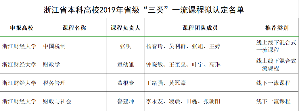 本网讯 近日,浙江省教育厅公布了2019年省级一流课程拟认定名单,公司《财政学》、《中国税制》、《税务管理》、《财政与社会》4门课程成功入选,入选数目位居全校前列。