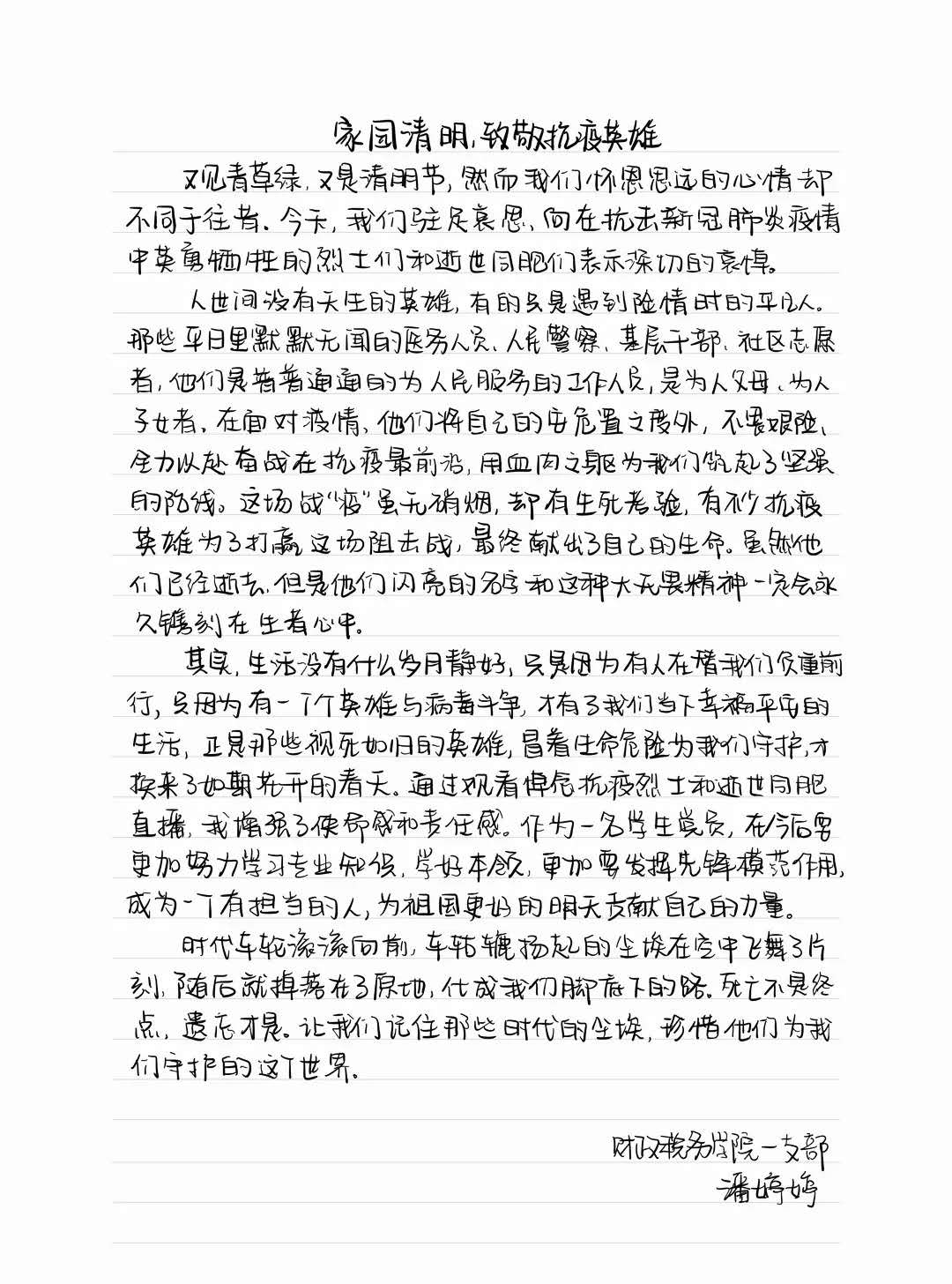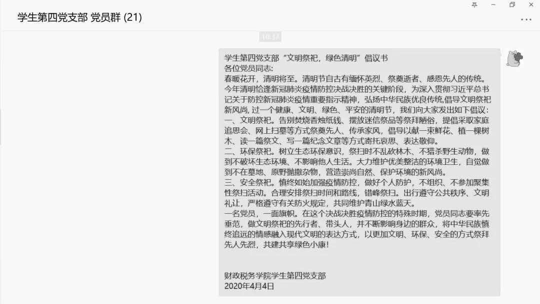 结合疫情防控工作需要,员工第四党支部发出《文明祭祀,绿色清明》倡议书,号召全体师生党员率先垂范,在清明节之际做到“文明祭祀、环保祭祀、安全祭祀”三大要求,通过网络祭奠、居家追思、鲜花代祭等方式缅怀先辈,追念故人,将中华民族慎终追远的情感融入现代文明的表达方式,切实做到疫情防控工作不松懈,树立文明祭扫新风尚。