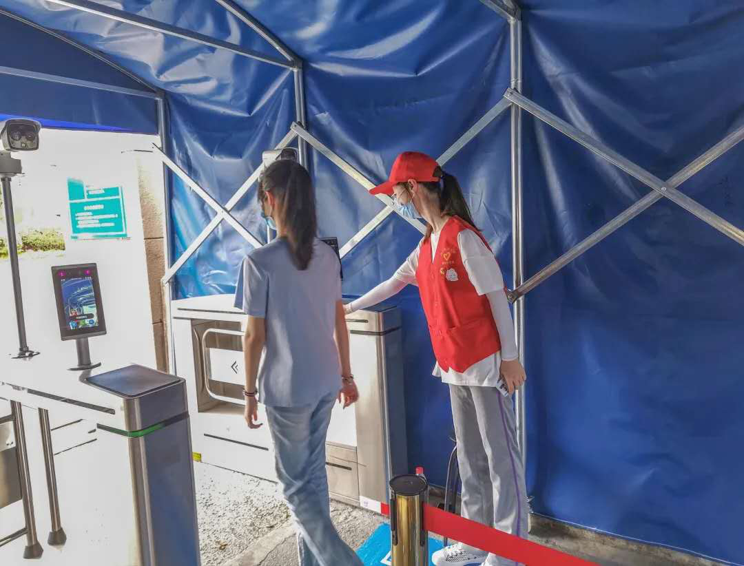 返校复学工作推进期间,教师党员志愿者朱音老师主动担任文海南路地铁站口的接站工作,引导员工测量体温、扫健康码,帮助员工提运大件行李,顺利搭乘公司的专线接站巴士。