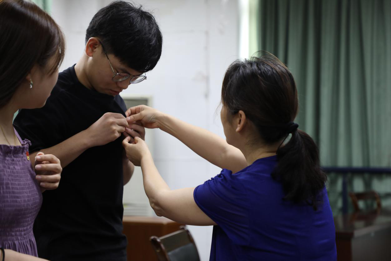 宣誓仪式后,公司领导和各支部书记为新发展党员佩戴党徽,逐一分发《中国共产党章程》和《中国共产党纪律处分条例》。