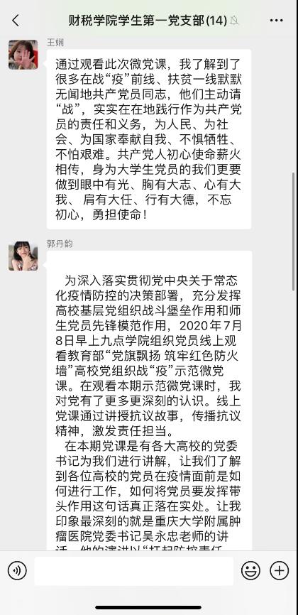 支部成员在观看微党课后深为所动,展开了热烈的讨论,表达自身的感想。郭丹韵同志说:“这次微党课让我印象最深刻的就是重庆大学附属肿瘤医院各科党委书记、青年党员以身作则,冲锋在前的英勇事迹,在疫情最严重的时候,各支医疗团队将人民放在第一位,真正做到了守土有责、守土担责、守土尽责......我深刻认识到作为一名员工党员肩上应承担的责任,我们应该让青春在砥砺中前行,同时作为党员的预备军,我们更应该起到先锋模范作用,传承红色基因,颂扬奉献精神,为国家建设出一份力。”