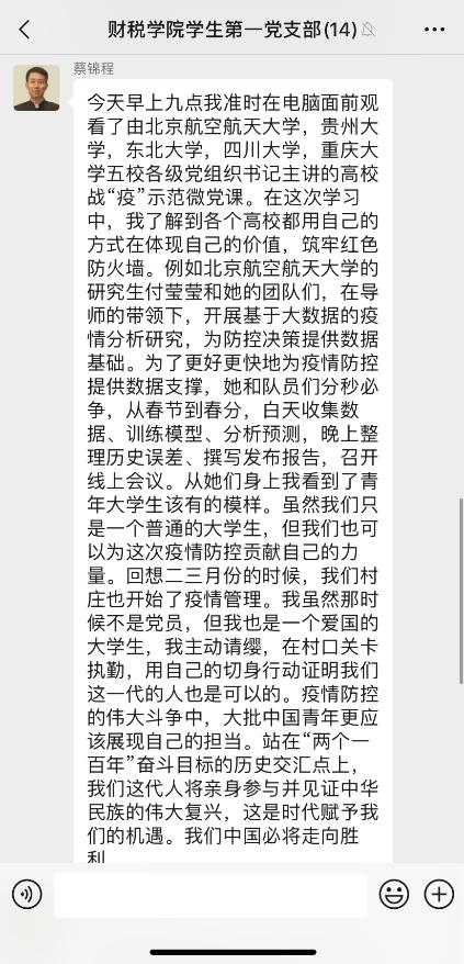 蔡锦程同志分享道:“在这次学习中,我了解到各个高校都用自己的方式在体现自己的价值,筑牢红色防火墙。例如北京航空航天大学的研究生付莹莹和她的团队们,在导师的带领下,开展基于大数据的疫情分析研究,为防控决策提供数据基础。为了更好更快地为疫情防控提供数据支撑,她和队员们分秒必争,从春节到春分,白天收集数据、训练模型、分析预测,晚上整理历史误差、撰写发布报告,召开线上会议。从她们身上我看到了青年老员工该有的模样。虽然我们只是一个普通的老员工,但我们也可以为这次疫情防控贡献自己的力量。回想二三月份的时候,我们村庄也开始了疫情管理。我虽然那时候不是党员,但我也是一个爱国的老员工,我主动请缨,在村口关卡执勤,用自己的切身行动证明我们新一代青年的力量。疫情防控的伟大斗争中,大批中国青年更应该展现自己的担当。”