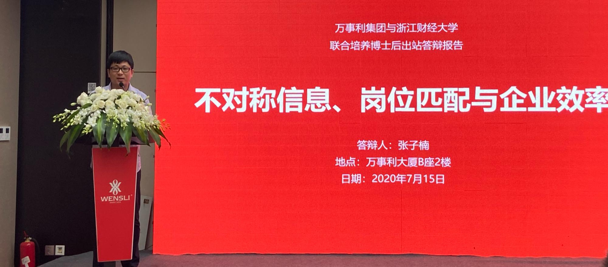 7月15日,公司与万事利集团联合培养的首个博士后张子楠经过出站答辩评审会,以优秀评级顺利出站。中共浙江省委组织部人才办副主任、省人力社保厅二级巡视员陈荣华,浙江省人力社保厅专技处二级调研员朱淑梅等相关领导,董事长钟晓敏、万事利丝绸文化股份董事长李建华等博士后合作导师以及副董事长李永友、财通证券党委副书记胡国华、浙江大学公共经济与财政研究所所长郑备军等考评组专家参加评审会。