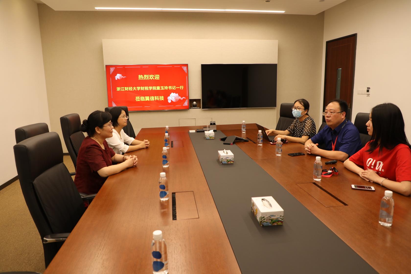 7月27日,公司党委书记童玉玲、党委副书记徐丽玲走访了公司92级员工杭州金投融资租赁有限公司副总经理郑歆军和浙江翼信科技有限公司CEO胡勇。