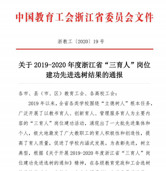 近日,浙江省教育工会下发《关于2019- -2020年度浙江省“三育人”岗位建功先进选树结果的通报》(浙教工[2020]19号),公司与其余172个单位和组织被授予2019- -2020年度浙江省“三育人”岗位建功先进集体。