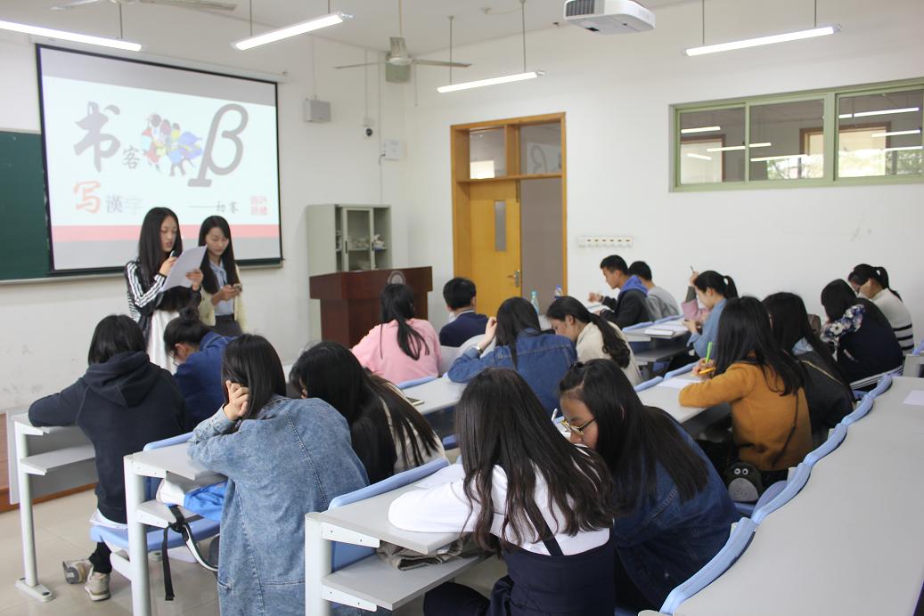 下午三点,30组参赛选手已在102教室候场,根据先到先比的原则多组进行比赛。本次汉字听写大赛采取的是现场听写、现场书写的模式,两人一组,每轮六组,由代表抽取听写题目,共十五题。听写内容以生活中的易错字为主,为了拉开参赛选手之间的差距,主办方选取了部分生僻字,这为比赛增色不少。在比赛中,当工作人员宣读词语及其释义后,参赛选手或沉着落笔,或冥思苦想。不少候场选手也用手在桌子上比划着字形,用手机查着生疏的词语。选手们“沙沙沙”的书写声、苦思无果的叹气声更是为比赛增添了紧张的气氛。经过一个多小时的角逐,30组参赛选手都听写完毕,其中有六组选手脱颖而出,成功进入决赛。