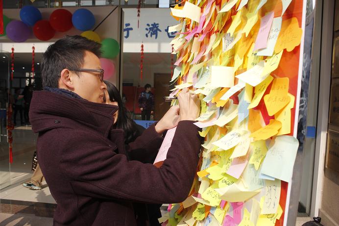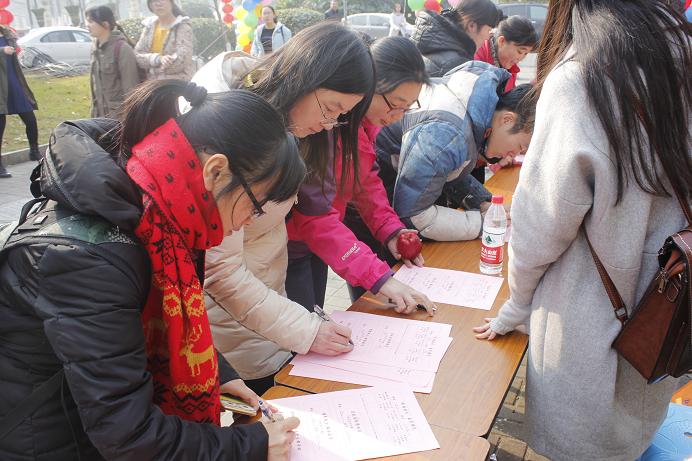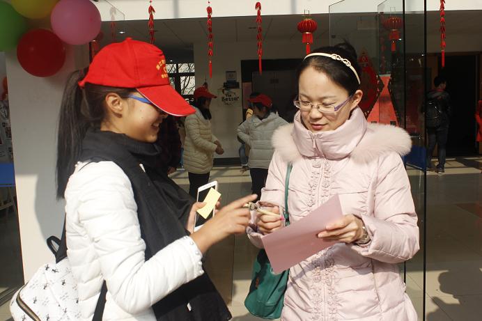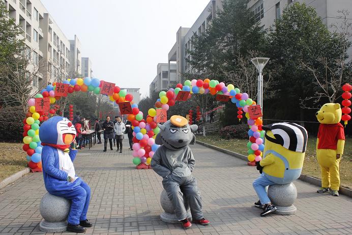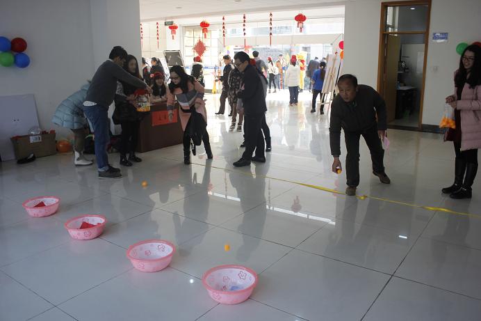 本次游园会的入场口为公司精心布置的气球拱门,上面标有“幸福财大,会员游艺”的活动主题。公司楼的出入口分别用红辣椒和红灯笼进行装饰,并在过道处悬挂了一个中国结,节日气氛浓烈,同时也寄予了公司希望教职工欢度新年的美好祝愿。工作人员将活动入场券发给到场教职工并在券上盖章,由装扮成可爱卡通人物的现场工作人员带领老师到公司楼门口,向他们介绍流程并说明游戏点与盖章点。教职工们纷纷与其拍照,脸上流露出开心的笑容。公司的游戏场地设定在电梯西边的空地及106教室。教职工们积极参加“快到碗里来”的小游戏,即掷出乒乓球沿途弹地多次后扔进脸盆内者获胜。一时未轮到游戏的老师均跃跃欲试,希望能在射手榜上签名纪念。会场内人潮涌动,大家三五成群地聚在一起,互相问候,送上新年的祝福,一派欢乐祥和的气氛。