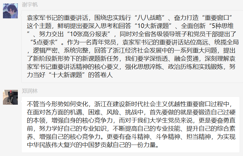 谢宇帆同志表示:“袁家军书记的重要讲话,围绕忠实践行‘八八战略’、奋力打造‘重要窗口’这个主题,鲜明提出要深入思考和回答‘10大新课题’、全面创新‘5种思维’、努力交出‘10张高分报表’,同时对全省各级领导班子和党员干部提出了‘5点要求’。作为一名青年党员,袁家军书记的重要讲话站位高远、统揽全局,逻辑严密、系统完整,回答了浙江经济社会发展中的一系列重大问题,提出了新阶段新形势下的新课题新任务,我们要学深悟透、融会贯通,深刻理解袁家军书记重要讲话精神的核心要义,强化思想淬炼、政治历练和实践锻炼,努力当好‘十大新课题’的答卷人。”