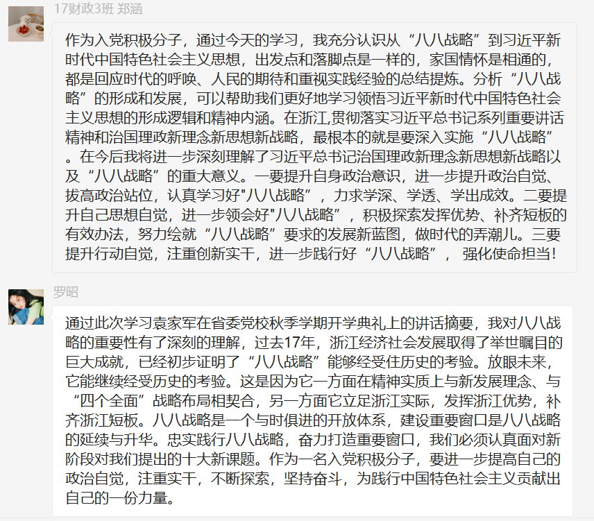 郑涵同志谈到:“作为入党积极分子,通过今天的学习,我充分认识从‘八八战略’到习近平新时代中国特色社会主义思想,出发点和落脚点是一样的,家国情怀是相通的,都是回应时代的呼唤、人民的期待和重视实践经验的总结提炼。分析‘八八战略’的形成和发展,可以帮助我们更好地学习领悟习近平新时代中国特色社会主义思想的形成逻辑和精神内涵。贯彻落实习近平总书记系列重要讲话精神和治国理政新理念新思想新战略,最根本的就是要深入实施‘八八战略’。通过此次线上学习,我进一步深刻理解了习近平总书记治国理政新理念新思想新战略以及‘八八战略’的重大意义。一要提升自身政治意识,进一步提升政治自觉、拔高政治站位,认真学习好‘八八战略’,力求学深、学透、学出成效;二要提升自己思想自觉,进一步领会好‘八八战略’,积极探索发挥优势、补齐短板的有效办法,努力绘就‘八八战略’要求的发展新蓝图,做时代的弄潮儿;三要提升行动自觉,注重创新实干,进一步践行好‘八八战略’,强化使命担当!”