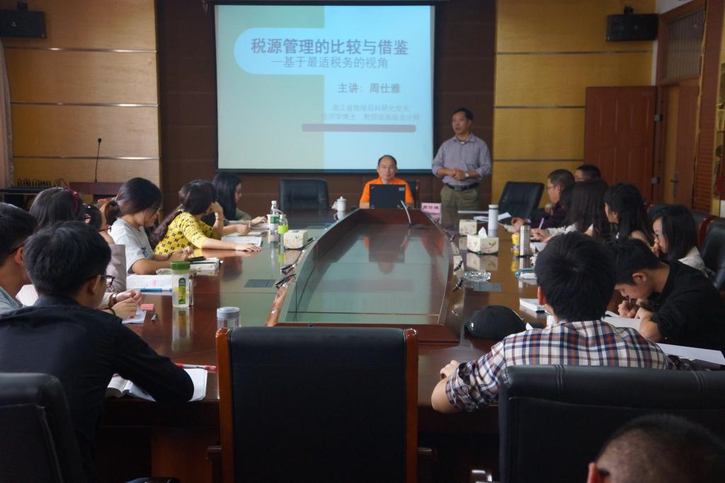 下午,浙江省地税局科研处处长、经济学博士、教授级高级会计师周仕雅应邀来公司作了“税源管理的比较与借鉴—基于最适税务的视角”的专题讲座。此次讲座由沈玉平经理主持,公司税务专业师生参加。