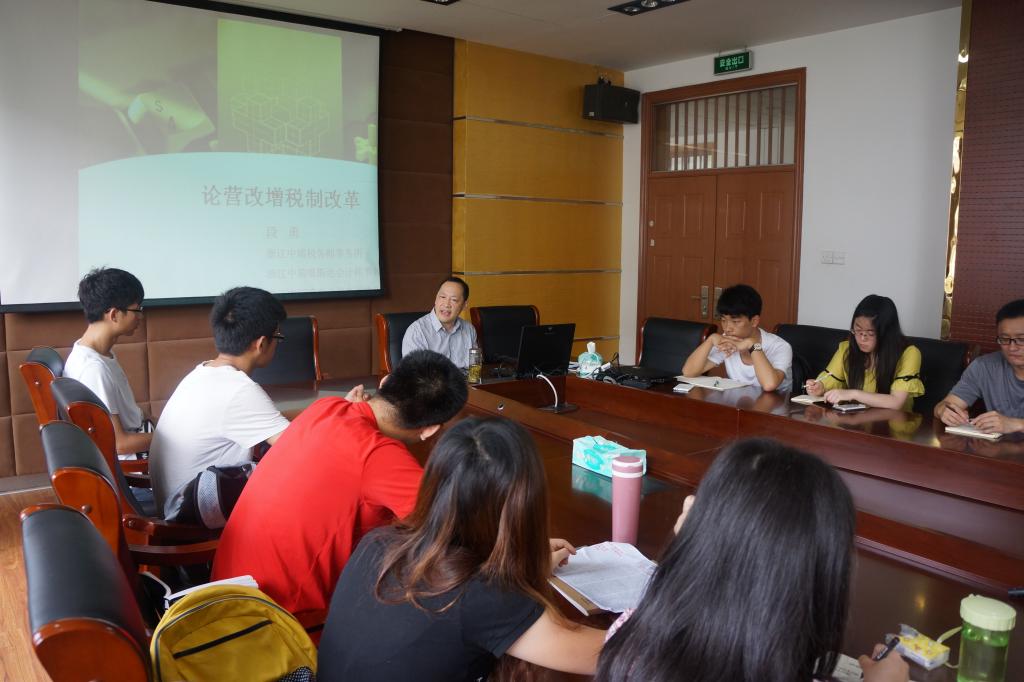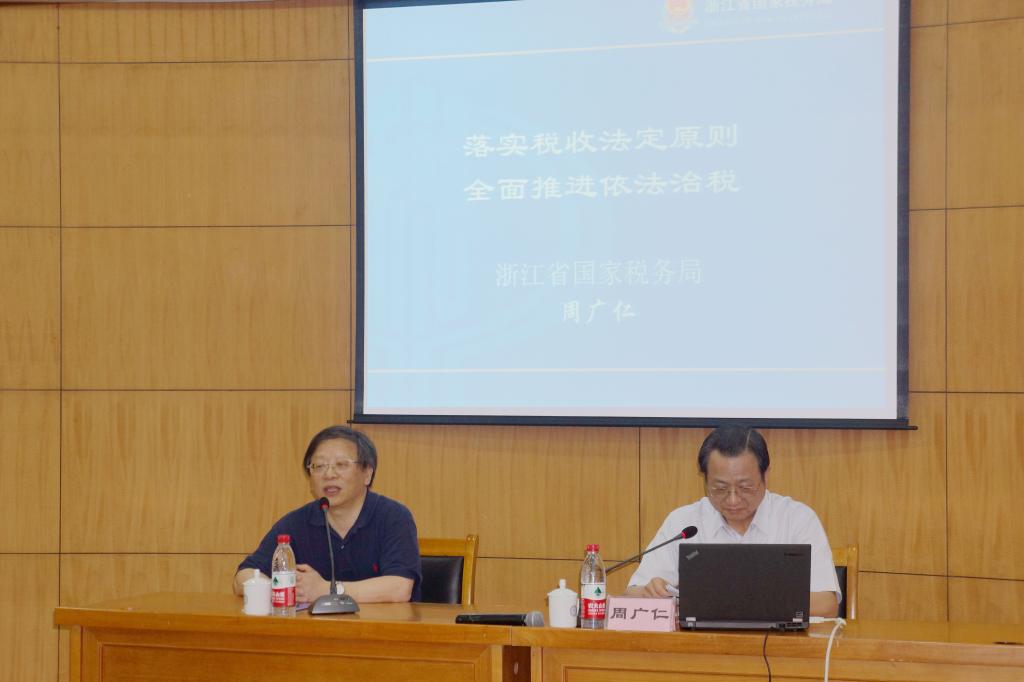 浙江省国税局局长周广仁等七位财税部门领导、知名会计师和税务师事务所合作人应邀作了关于税收征纳、税收债券、投融资税收等最新税收政策趋势的讲座。讲座分别由财政与公共管理公司经理沈玉平、税务专硕项目负责人董根泰主持,全体税务专业硕士和部分校内硕导一起聆听了本系列讲座。讲座中,专家们结合工作中的大量案例,剖析了税制改革的最新动态,对趋势政策进行了简要分析,说明了“营改增”后企业如何防税务风险并结合丰富的实际案例对政策进行解读;介绍了企业破产清算程序中税收债权的分类以及企业破产清算程序中税收债权的申报等问题;或者从大数据时代对税务机关、纳税人和税务师事务所三个方面的影响着手,从企业所得税新纳税申报表主要变化切入,讲述了新旧企业所得税申报表的差异性。内容丰富多彩,授课深入浅出。