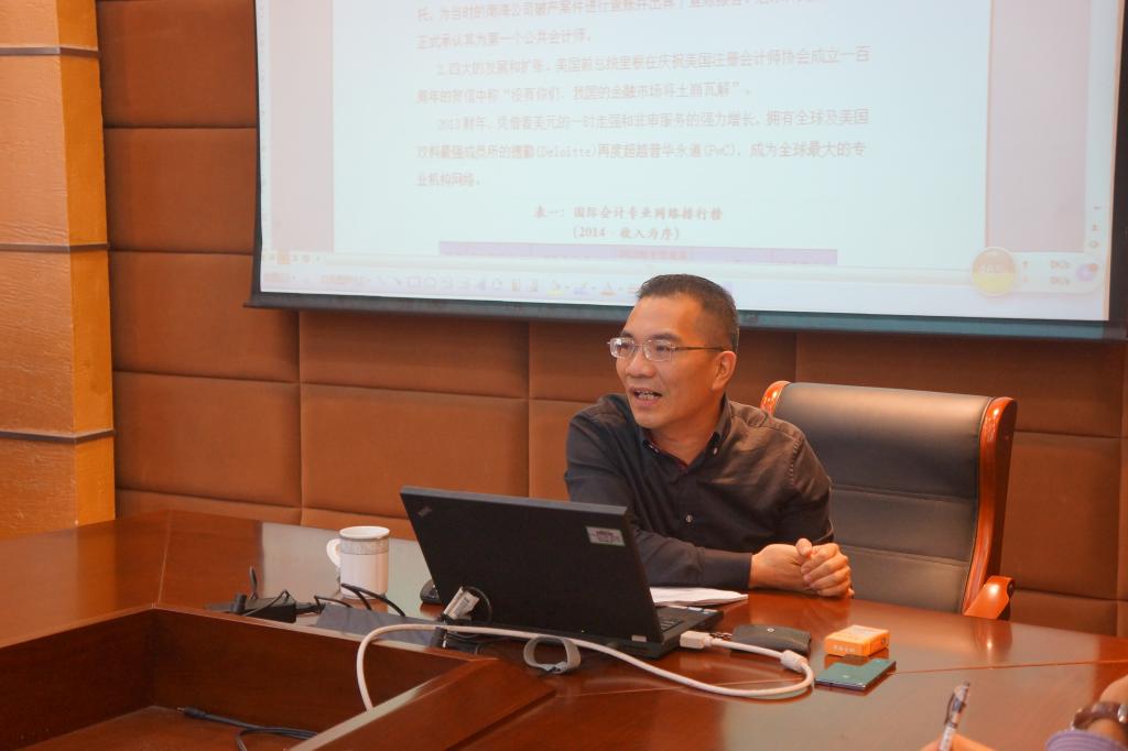 ,天健会计师事务所副总裁王国海应邀前来公司讲学,并作了题为《了解注册会计师》的专题讲座。此次讲座由yl23411永利官网登录财政与公共管理公司董根泰教授主持,沈玉平经理、司言武教授出席,公司2014级税务硕士参加。