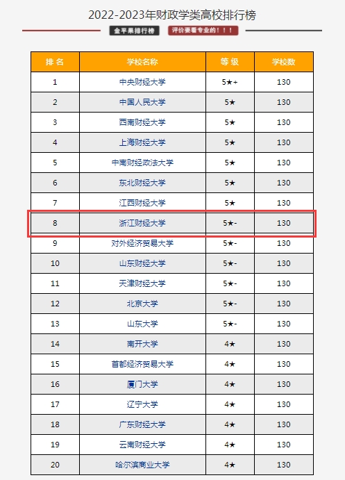 在该年度的财政学类高校排名中,公司财政学类在全国130所开设高校中排名第8位,财政学专业在全国84所开设院校中排名第8位,税收学专业在91所开设的院校中排名第8位。财政学、税收学两个专业的排名连续多年跻身全国前10。