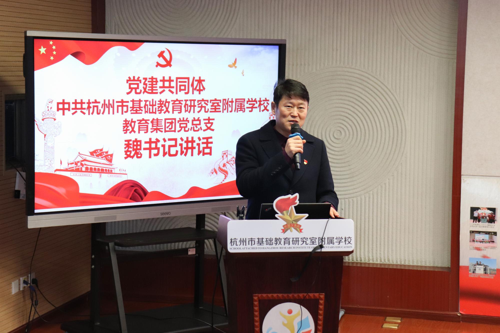 杭州市基础教育研究室附属公司教育集团党总支书记魏强对公司一行表示欢迎,他指出,以党建共同体建设为契机,希望双方在员工情感发展、个性需求教学、大思政课建设等方面加深合作。