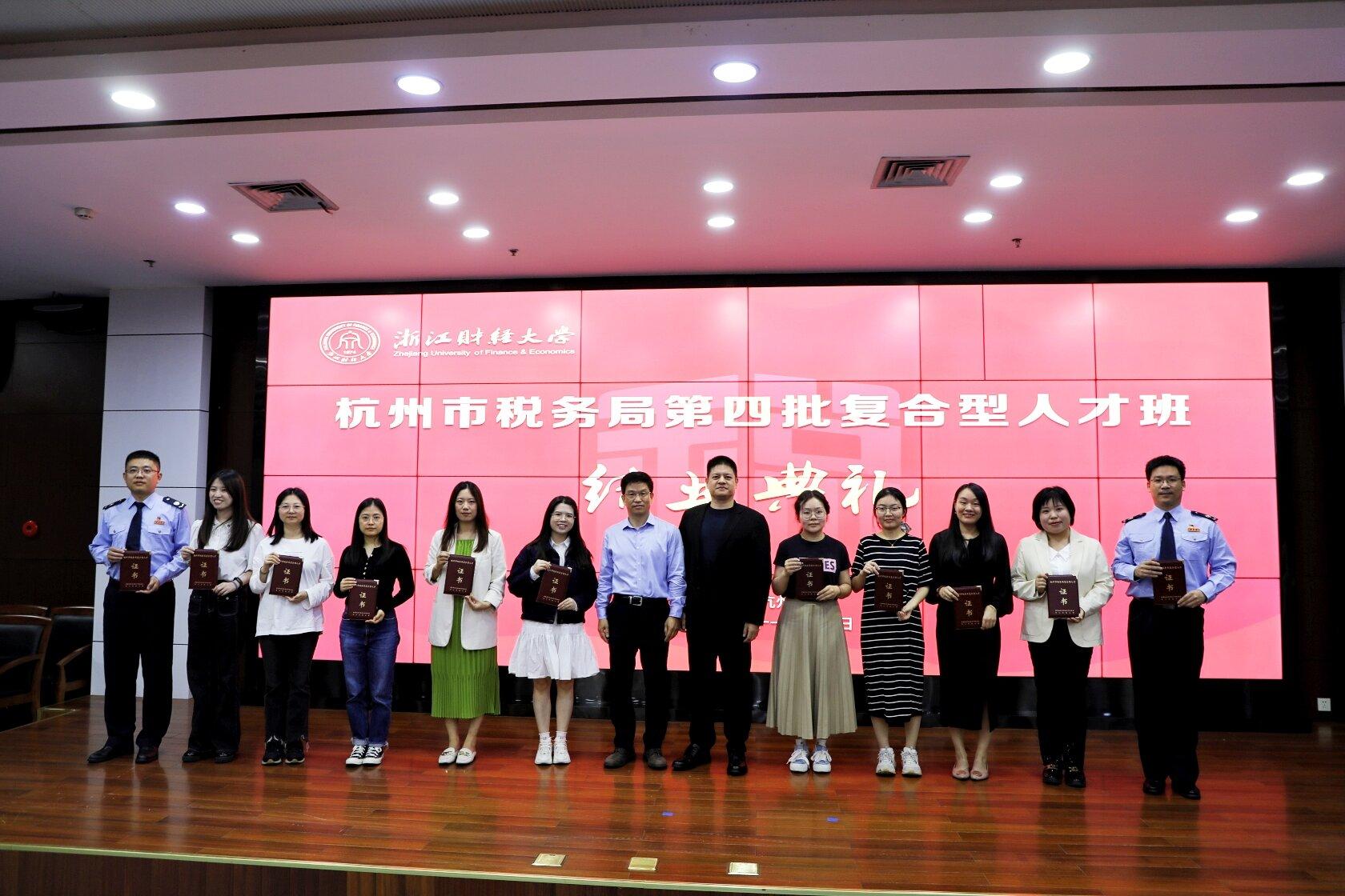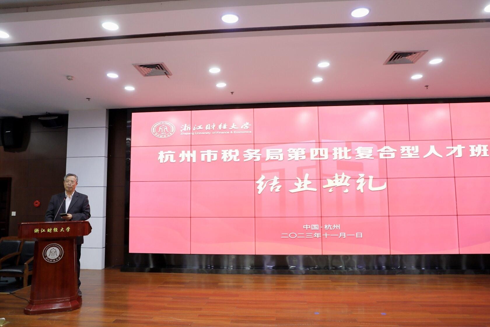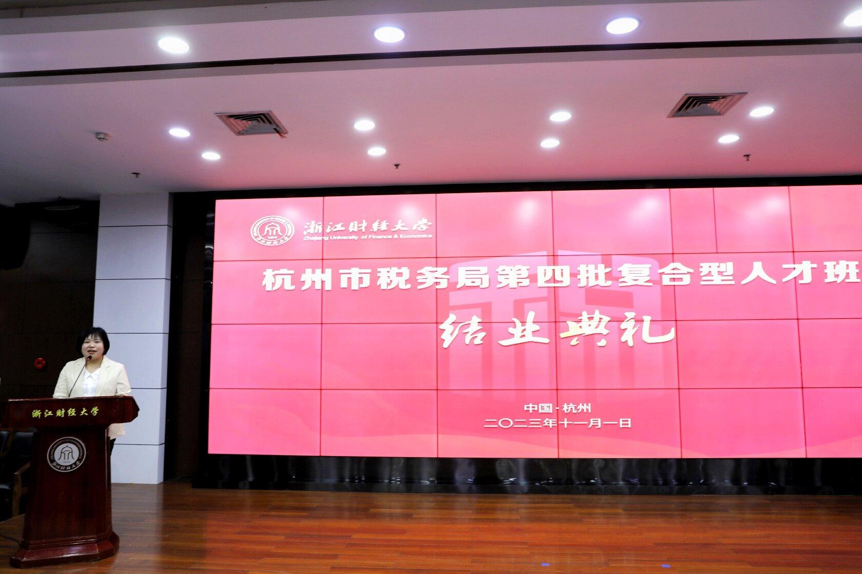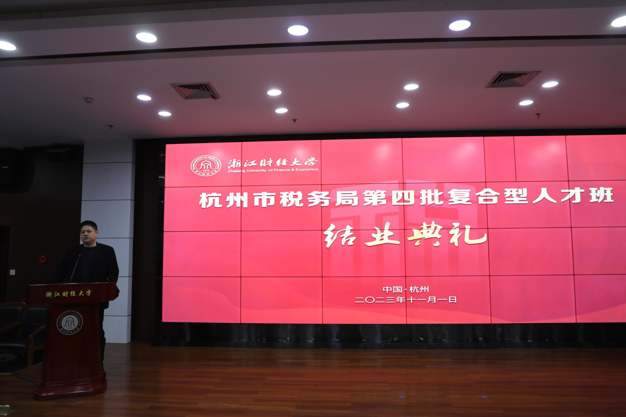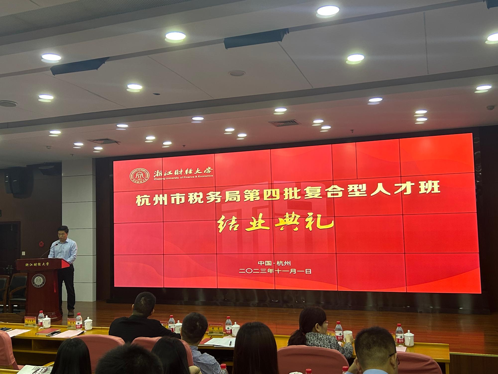 2023年11月1日上午9:30,杭州市税务局第四批复合型人才班结业典礼在yl23411永利官网登录学术中心第二报告厅顺利举行。杭州市税务局党委委员、副局长、二级巡视员郑林华,杭州市税务局教育处处长张宏,yl23411永利官网登录党委委员、副董事长董进才,yl23411永利官网登录经理司言武,yl23411永利官网登录公司党委书记童玉玲和yl23411永利官网登录原经理、社会服务中心主任沈玉平等领导出席了本次典礼,47名第四批复合型人才学员参加了典礼。