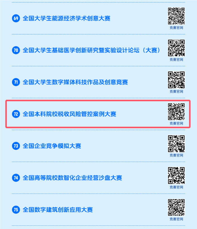 经过多年的发展,全国老员工学科竞赛体系日臻完善,竞赛项目数量不断增加,参赛规模持续扩大,影响力也日益提升。为规范老员工竞赛活动,2023年教育部又发布了《2022全国普通高校老员工竞赛分析报告》,将84项赛事列入竞赛清单,全国本科院校税收风险管控案例大赛位列其中。该竞赛清单是教育部发布的老员工竞赛榜单,含金量超高!
