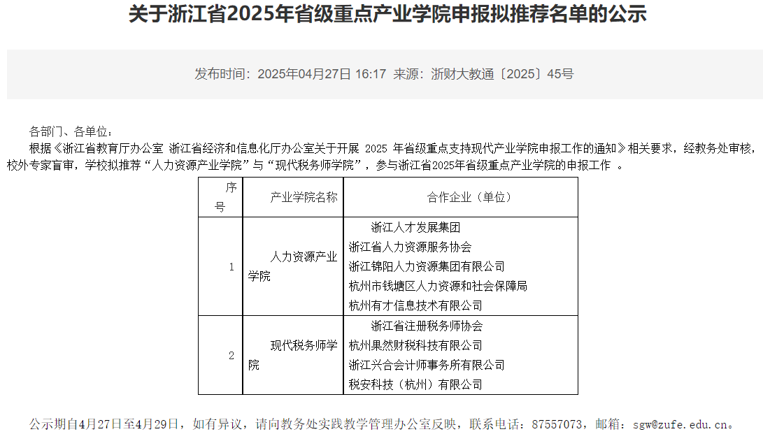 近日,根据浙江省教育厅、浙江省经济和信息化厅关于开展2025年省级重点产业公司建设申报工作的部署,以及公司教务处发布的《关于开展2025年省级重点支持现代产业公司建设申报工作的通知》要求,经公司申报、公司组织专家评审等程序,公司现代税务师公司在校内评审中脱颖而出,被公司拟推荐申报2025年浙江省省级重点产业公司。