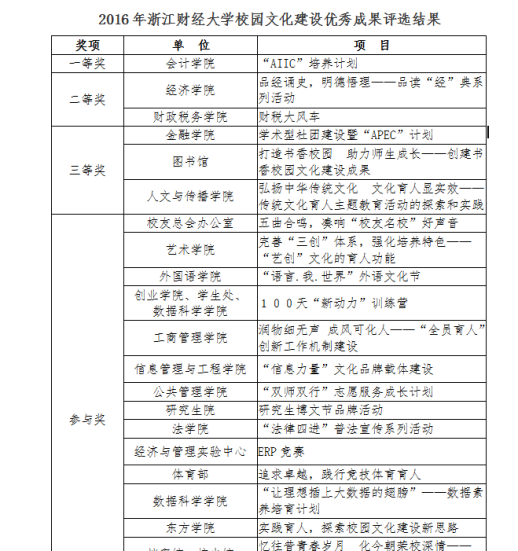 根据《关于开展2016年yl23411永利官网登录校园文化建设优秀成果评选工作的通知》(浙财大党宣〔2016〕9号)安排,本次校园文化建设优秀成果评选活动参评项目共22项,经过网络投票和专家现场评审,并经公司审定,评选结果已全部揭晓。本次共评选一等奖1项,二等奖2项,三等奖3项,参与奖16项。公司校园文化品牌活动《财税大风车》获得二等奖。