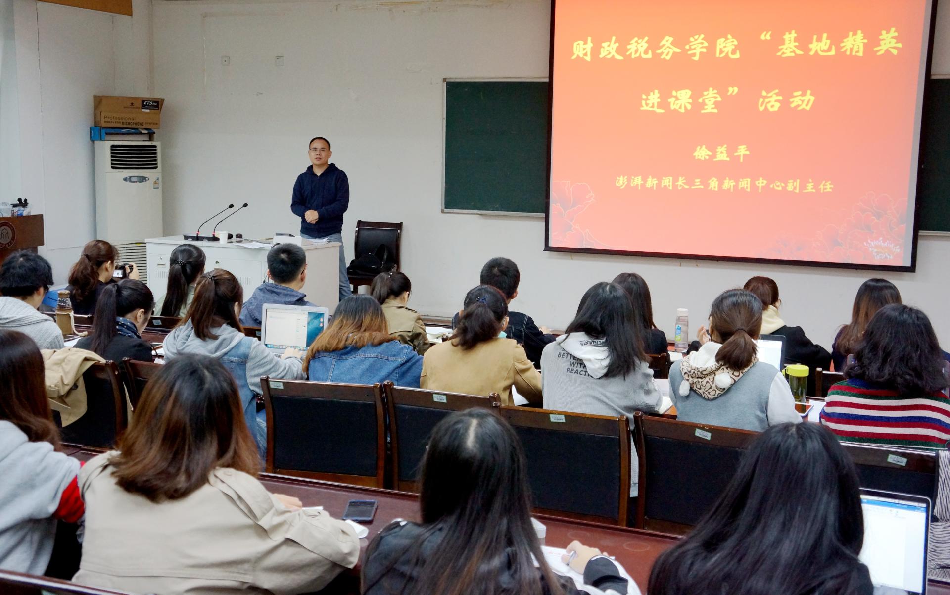11月14日上午,澎湃新闻长三角新闻中心副主任徐益平老师应邀在财税公司楼106教室为14、15级财经新闻的同学做“财经新闻基地精英进课堂”系列讲座。讲座由《财经新闻报道》任课老师季陈翔主持,由主讲嘉宾徐益平老师以澎湃新闻三个成功的专题报道为例向员工们分享了澎湃是如何做大型深度报道的,现场反响热烈,互动不断。