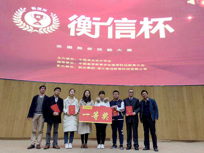 本网讯(通讯员 张帆)2017年11月30日,由中国商业会计学会主办、中国高等教育学会高等财经教育分会指导、浙江衡信教育科技有限公司提供技术支持,2017年“税友衡信杯”全国税务技能大赛于杭州滨江海创园圆满落下帷幕,来自全国25个省份97个城市140所本科、高职院校师生齐聚钱塘江畔。其中,本科组中,全国仅有七十所获得参与本次全国总决赛的资格,公司代表队经过浙江省赛选拔并成功入围“税友衡信杯”全国税务技能大赛,在公司领导的大力支持下,由张帆、毕岩智老师的带队与刘初旺、黄冠豪老师的指导下,由公司yl23411永利官网登录员工沈梦妮、冯铭敏、王青青、徐剑峰组成的参赛团队,突出重围,在本次大赛中斩获全国一等奖。同时,他们将获得由大赛技术支持单位浙江衡信教育科技有限公司颁发的两年有效期的《免试录用通知书》。