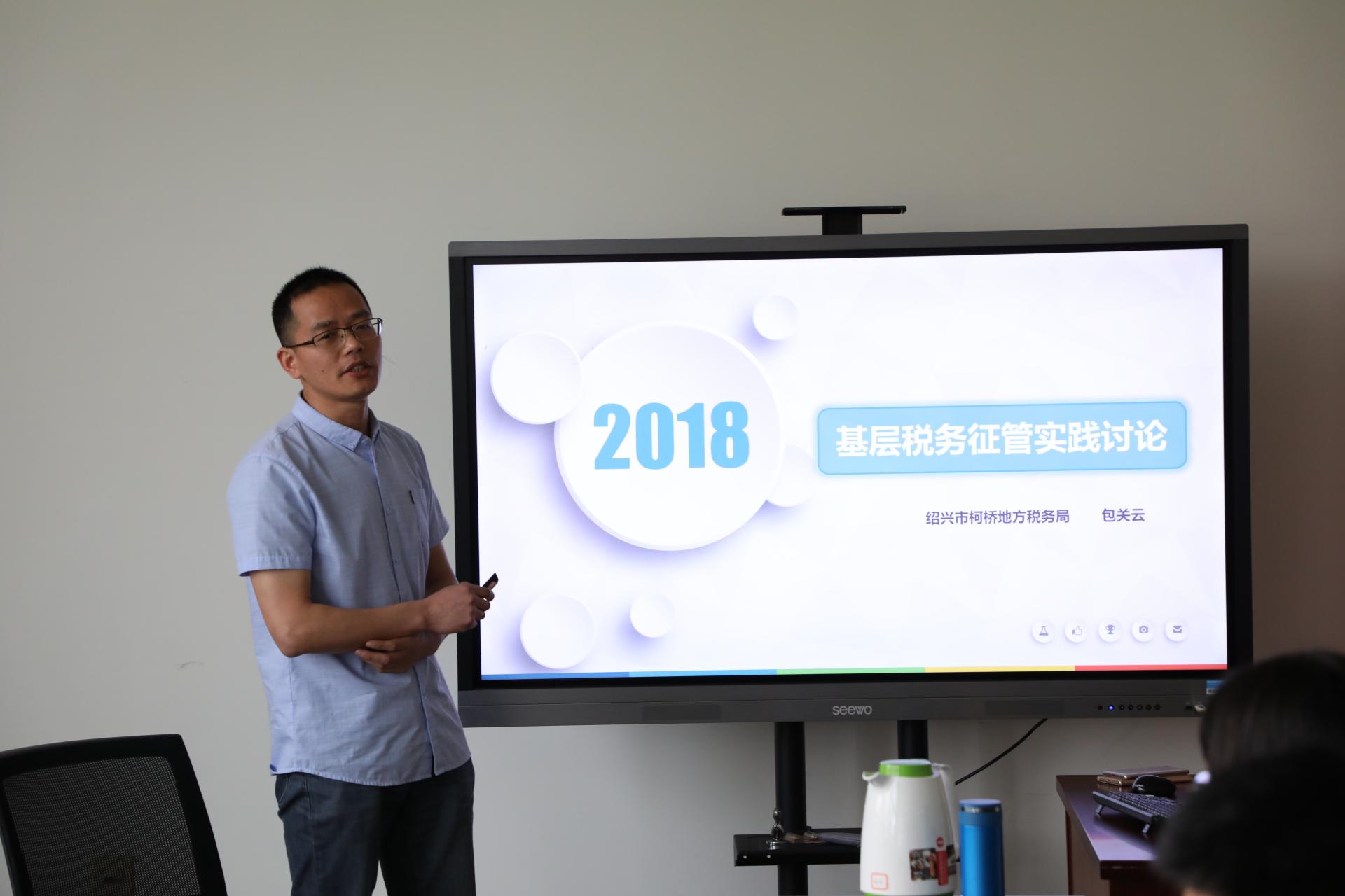 2018年05月10日星期四上午8点在公司楼302,绍兴市柯桥地方税务局轻纺城所所长做了一场主题为“基层税务征管实践讨论”的讲座,全体17级税务专硕研究生到场聆听。