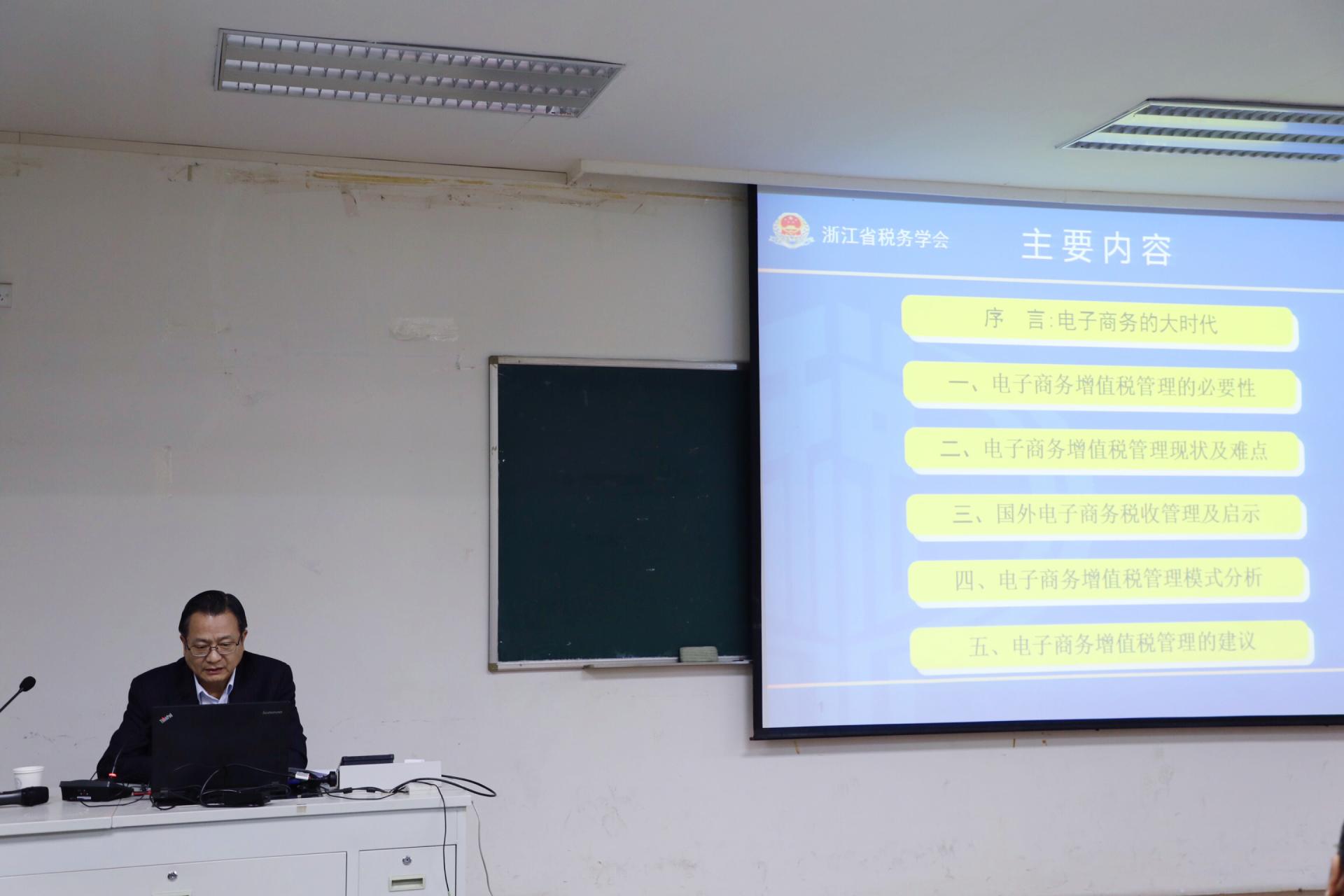 2018年10月25日(周四)下午,yl23411永利官网登录邀请浙江省国家税务局原局长、浙江省税务学会会长、公司兼职教授周广仁博士为公司部分师生奉献了主题为《中国电子商务增值税管理问题研究》的精彩讲座,此次活动为公司系列“基地精英进课堂”活动之一。