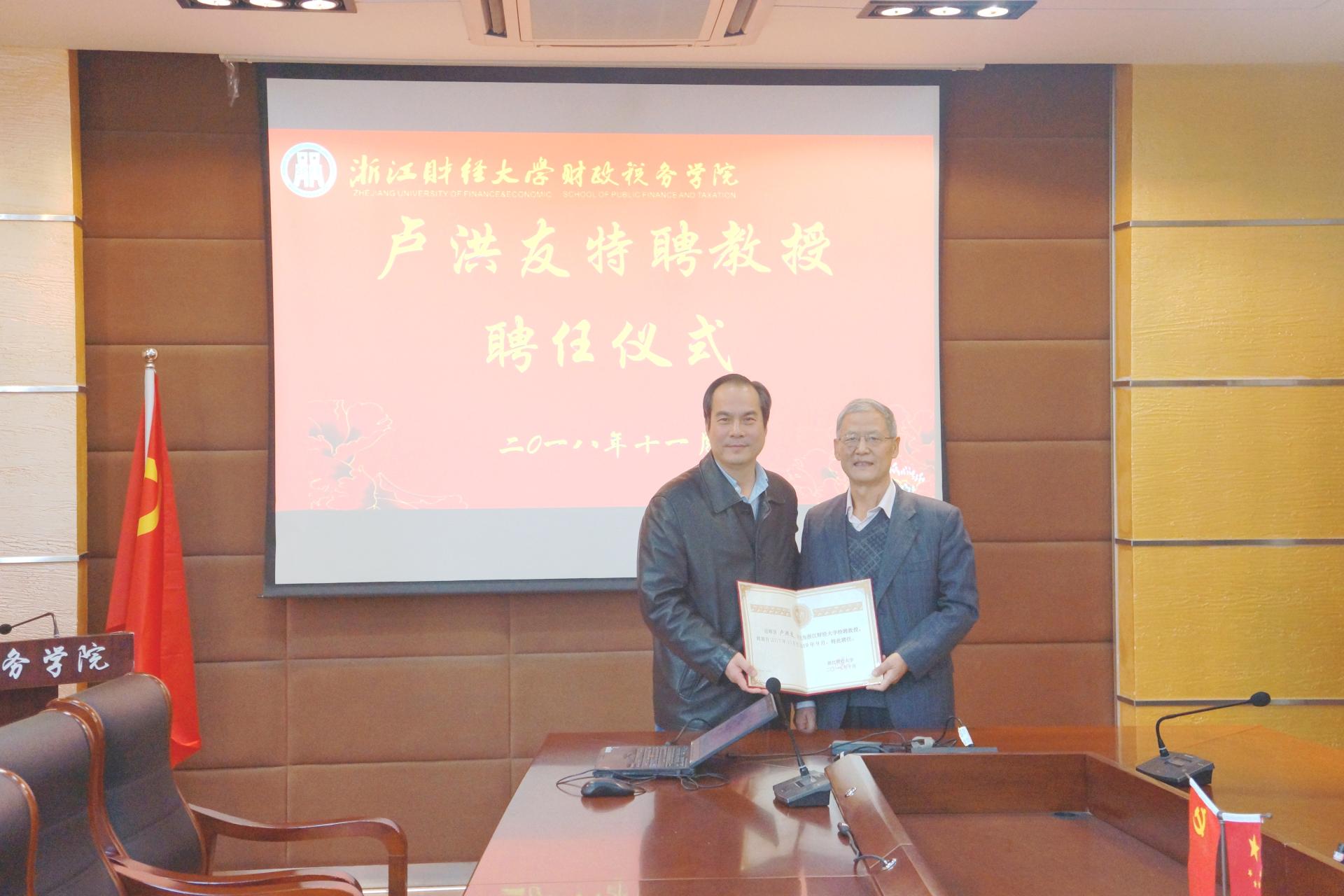 11月28日,武汉大学经济与管理公司教授、博士生导师、 国家社科重大项目、教育部人文社科重大攻关项目评审答辩专家卢洪友教授受聘为公司特聘教授。副董事长王奎泉出席聘任仪式并为卢洪友教授颁发聘书。
