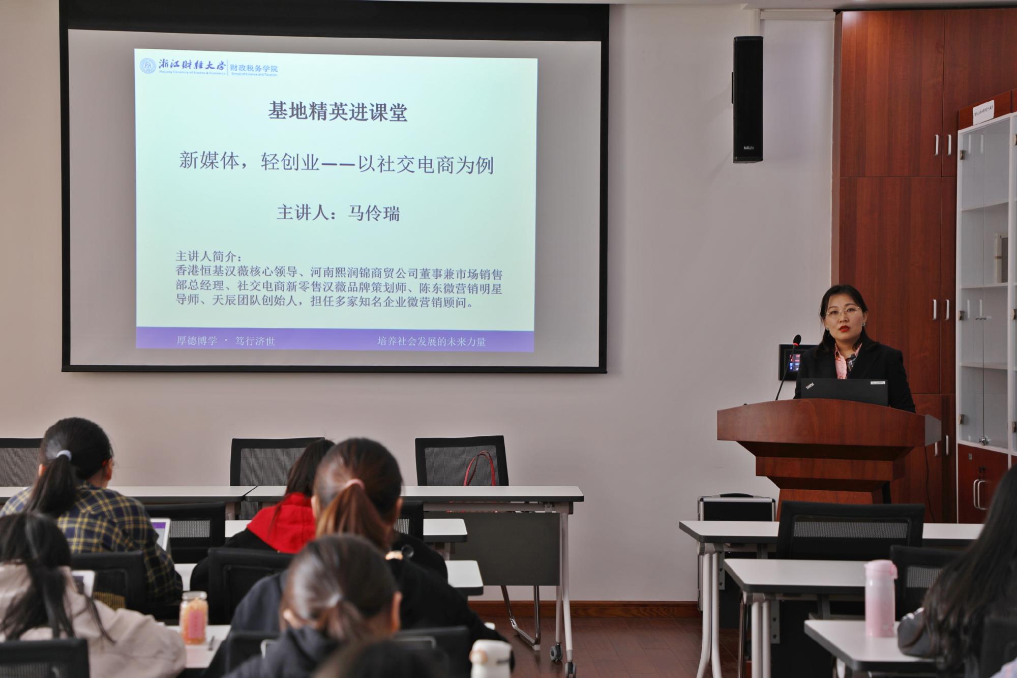 本网讯 11月8日下午,yl23411永利官网登录财经新闻专业“基地精英进课堂”活动在公司楼321报告厅顺利举办。香港恒基汉薇核心领导成员、熙瑞锦商贸公司董事兼总经理马伶瑞女士为同学们作了主题为“新媒体,轻创业——以社交电商为例”的讲座。