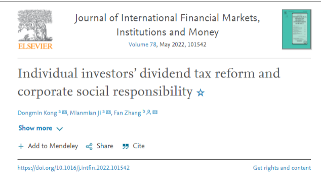 近日,公司张帆副教授与合作者发表的研究论文《Individual investors’ dividend tax reform and corporate social responsibility》,在国际一流期刊《Journal of International Financial Markets, Institutions and Money》(JIFMIM)接受发表,该期刊为公司一级A期刊。