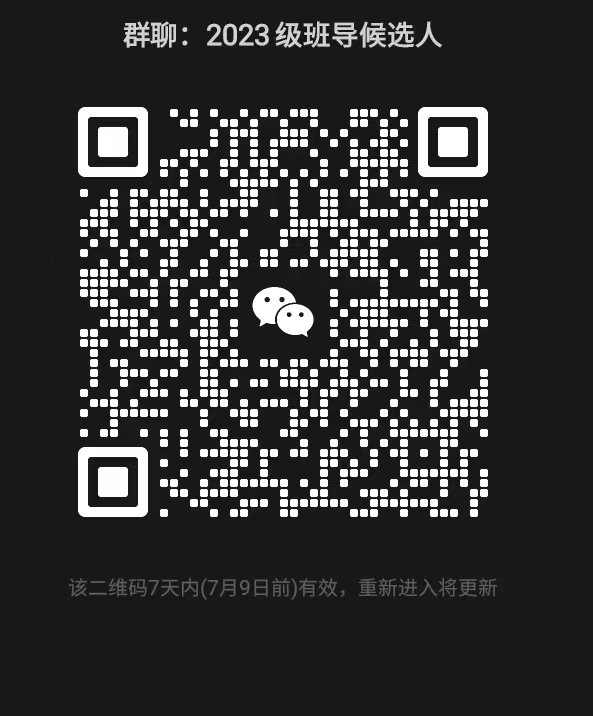 7月6日前:请有意申请新生班导的同学填好附件中的申请表发送至邮箱:jakemti@163.com(邮件主题及附件统一命名格式:专业班级-姓名)并加入2023级班导候选人微信群(进群后改名),后续安排线上面试。如有疑问请联系张博涵老师:0571-86731179